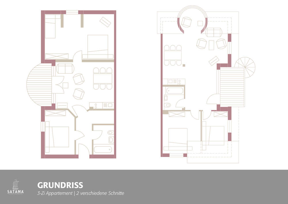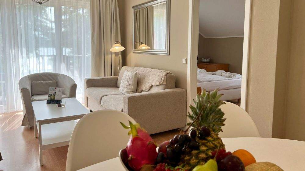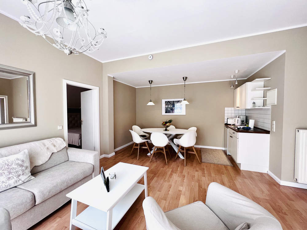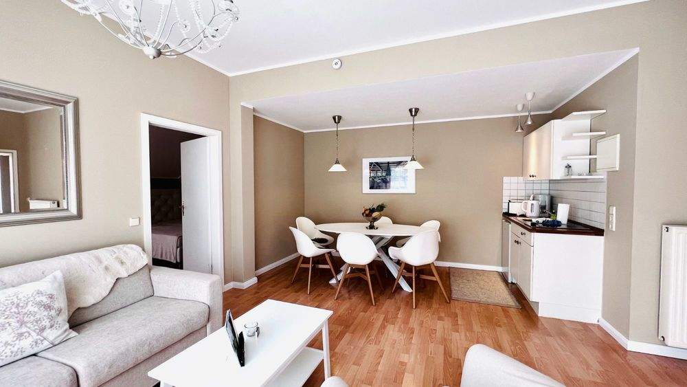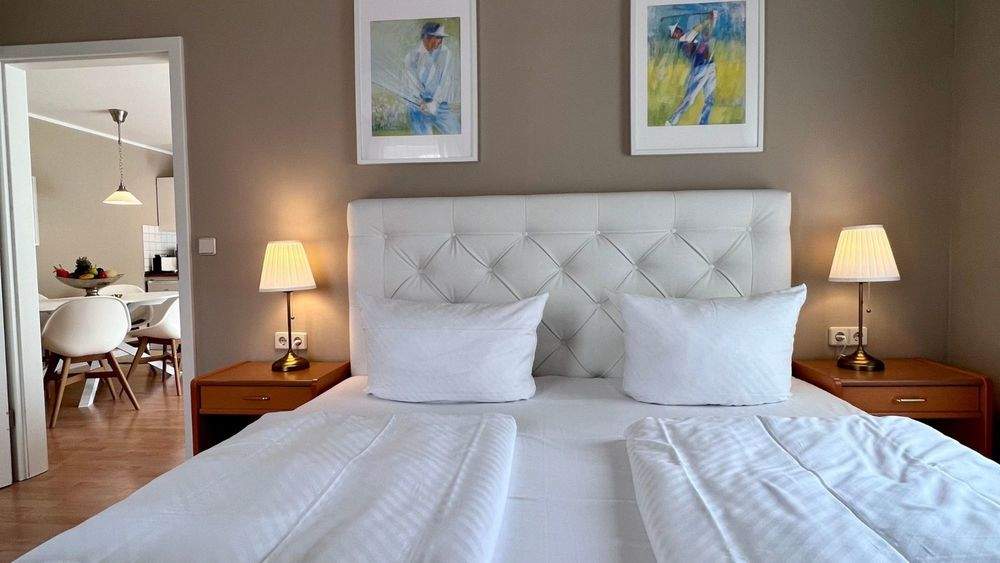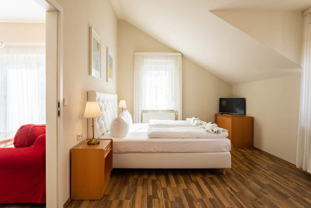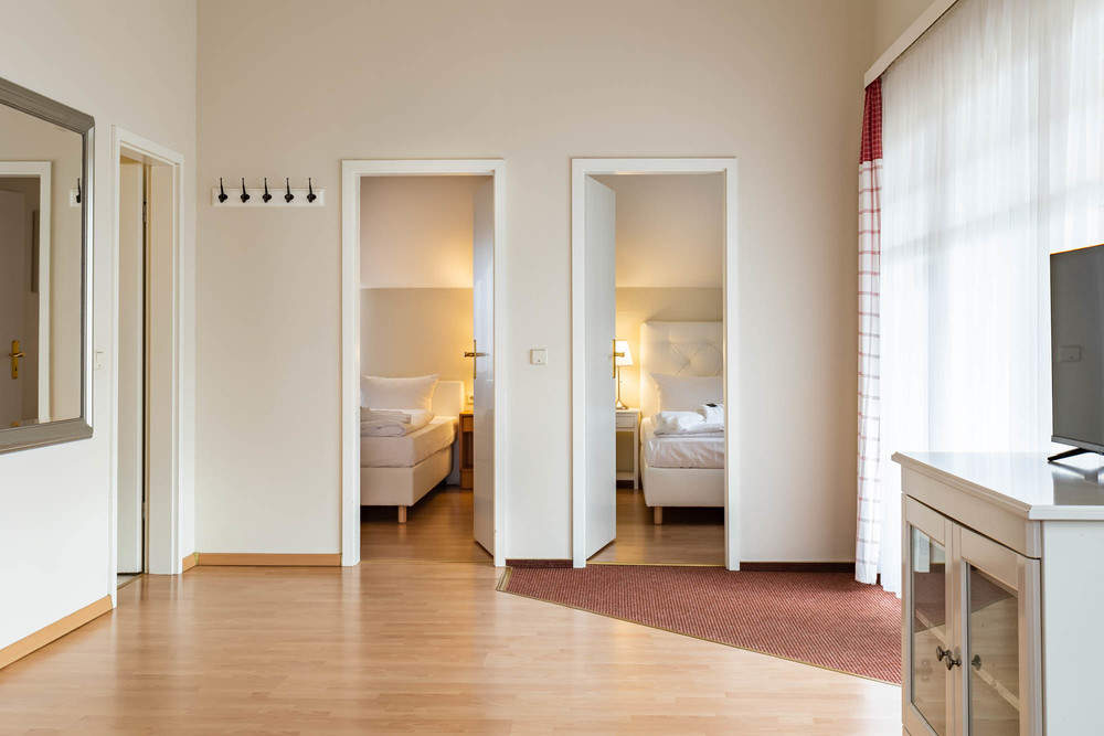 1 living room with mini kitchen and TV, balcony, 2 separate bedrooms, bathroom with shower or tub, for up to 4 people, extra beds for 2-3 additional people possible. The size of the apartments is approx. 60 m².
