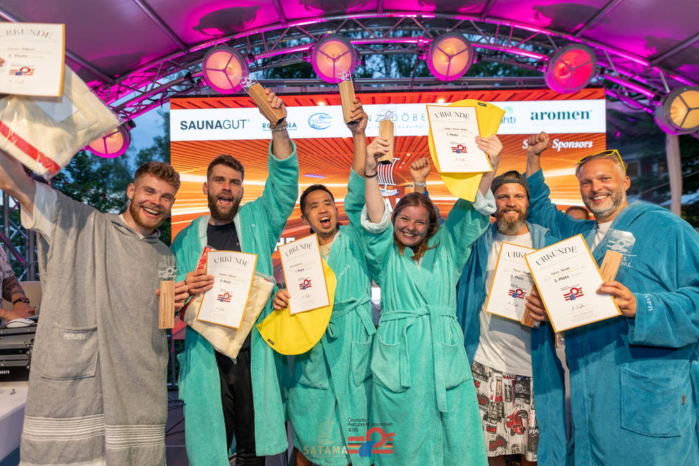 Mit dem nationalen Titel endet der heiße „Champions-Journey“ jedoch noch lange nicht für das SATAMA-Team und alle Qualifizierten. Vom 15. bis 21. September findet im schönen Verona, Italien im AQUARDENS die Aufguss-Weltmeisterschaft 2025 statt. Wir drücken den Teilnehmern die Daumen und freuen uns zum Vorglühen auf einen Besuch im SATAMA-Theater - hier wird es sicher die ein oder andere Übungs-Live-Session für unsere Gäste geben.