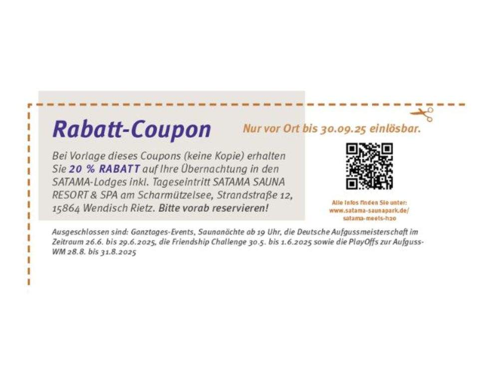 Bedingungen: Der "H2O meets SATAMA“-Coupon kann nur im Original und nur vor Ort an der SATAMA-Rezeption eingelöst werden. Er ist im Programm-Heft des "SATAMA meets H2O Herford" abgedruckt. Pro Coupon kann 1 Lodge gebucht werden (Ferienhäuser sind ausgenommen). Rabattiert wird ausschließlich die Rate "Übernachtung inkl. Sauna" buchbar ab 13.3. bis 30.9.2025. Aktionsende ist der 1.10.2025 * Der Tageseintritt in den SATAMA-Saunapark ist am Abreisetag nicht enthalten, kann aber auf Wunsch hinzugebucht werden.