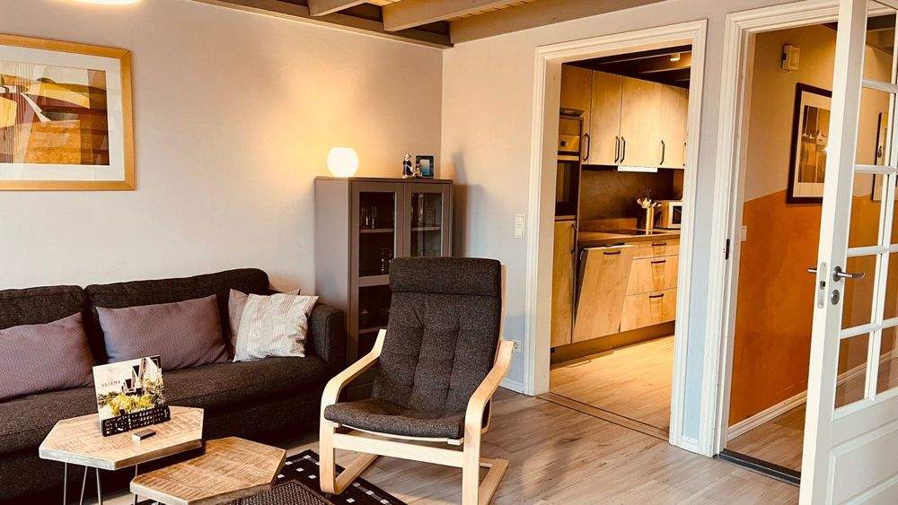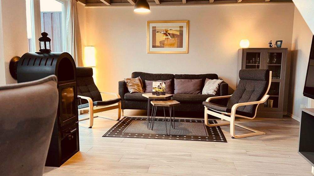 - Wohnzimmer mit Fernseher, Radio, Kaminofen, Essecke