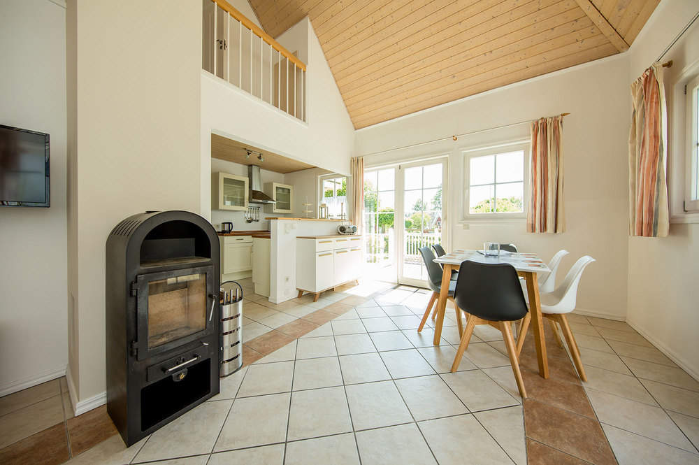 - Wohnzimmer mit Fernseher, Radio, Kaminofen, Essecke